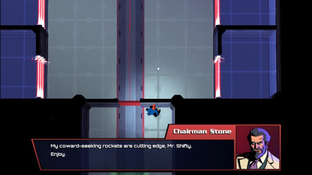Mr. Shifty, however, has a lot of obvious failings. First and foremost, the thin story is a fun thematic conceit, but it feels like most of it is loaded into the first 10 levels of an 18 level game. With the climax occuring roughly halfway through the game, the latter half feels like it plods along until the inevitable conclusion. There are even a couple of levels where you’re not sure why you’re still playing, until the simple story returns from being just plain non-existent. What would make these levels a little more tolerable is more motivation for you to continue, or putting the game’s biggest climax a little later. In between levels you get an indicator of where you currently are in the tower, and after the climax hit and I saw that I was only halfway through, it set poor expectations for the rest of the game.