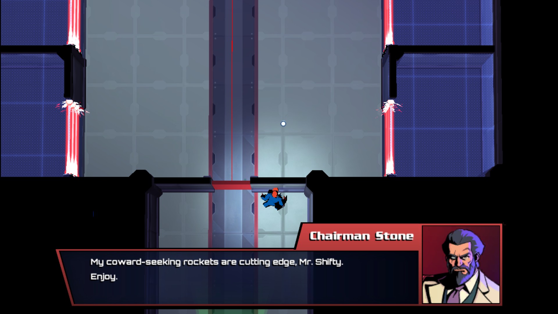 Mr. Shifty has a very light-hearted PG-13 tone that’s super endearing. The game starts off with you right in the middle of a major heist, playing as an anti-hero with inextricable superpowers. You work for a… government??? Crime syndicate??? That’s never really explained, but with good reason. Mr. Shifty doesn’t care about answering those questions. It wants you to know you’re on a heist, and heist you will. You must infiltrate Chairman Stone’s ultra secure skyscraper to steal his mega plutonium for some reason. It sounds important, so you MUST have it. This simple style of writing where ideas are only loosely explained fits the game perfectly. It feels like it’s written by a five year old, but that five year old’s dad, who’s kind of a funny dude, decided to punch it up for him and make a game out of it. There’s a line right at the beginning where your confidant Nyx calls Chairman Stone “an evil asshole” who’s “wanted for a bajillion criminal offences.” It was right then that I knew this game’s sense of humor was really gonna land for me. It didn’t fail, either, as throughout the game I got treated to really silly one-liners that I couldn’t stop cracking up over.