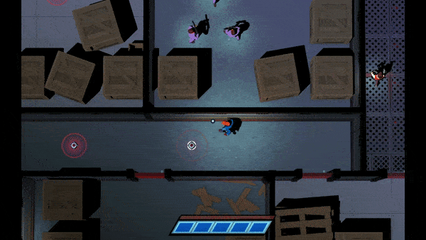 Where Mr. Shifty differs from its inspiration starts in its gameplay, adding a phase-shift mechanic that allows you to quickly dart around to other areas in combat and pass through walls. It’s very snappy and responsive, and just feels good to do. You’re limited to five consecutive uses though, requiring you to think about how to use your shifts in moment to moment gameplay. It also recharges quickly, so you never feel like you should be conserving your shifts. You’ll eventually wind up developing a nice rhythm to your shifts so that you never need to stop moving. There’s also a bullet time mechanic, which you get from a meter that fills as you beat enemies, and activates whenever you’re about to get hit by a bullet. You still can get hit by said bullet if you’re not careful, but it provides you with a free mistake to make and get away from. It encourages faster and more active play as opposed to hiding around corners and waiting, and grants the player with a tangible in game reward, compared to Hotline Miami’s score multipliers, for being less careful.